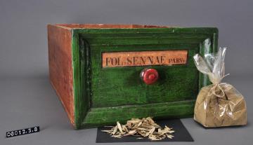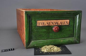 Schublade aus Nadelholz mit rotem Knauf und profilierter Vorderseite. Profil aufgeleimt und mit Holznägeln gesichert. Gezinkte Verbindungen (Schwalbenschwanzverbindung). Boden angeleimt und ebenfalls mit Holznägeln gesichert. Vorderfront grün, mit aufgeklebter, schwarz umrandeter, bräunlicher Papiersignatur. Enthält Kleine Senna, alexandrinische und tripolitanische in Pulver und Bruchstücken.