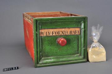 Schublade aus Nadelholz mit rotem Knauf. Profilierte Vorderfront, grün maserierend angemalen. Gezinkte Verbindungen (Schwalbenschwanzverbindung). Mittiger Abteiler aus Holz. Linkes Seitenteil aus älterer, rot angemalener, Schubladenvorderfront. Boden angeleimt und mit Holznägeln gesichert. Aufgeklebte, mit Signierapparat bedruckte Papiersignatur. Enthält Bockshorn-Pulver.