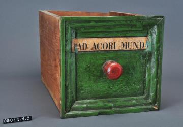 Schublade aus Nadelholz mit rotem Knauf. Profilierte Vorderfront, grün maserierend angemalen. Gezinkte Verbindungen (Schwalbenschwanzverbindung). Rechtes Seitenteil aus älterer, rot angemalener, Schubladenvorderfront. Boden angeleimt und mit Holznägeln gesichert. Aufgeklebte, mit Signierapparat bedruckte Papiersignatur. Enthielt Kalmuswurzel geschält.