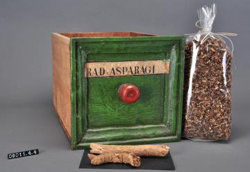 Schublade aus Nadelholz mit rotem Knauf. Profilierte Vorderfront, grün maserierend angemalen. Gezinkte Verbindungen (Schwalbenschwanzverbindung). Linkes Seitenteil aus älterer, rot angemalener, Schubladenvorderfront, wurde ca 1976 entnommen. Boden angeleimt und mit Holznägeln gesichert. Aufgeklebte, mit Signierapparat bedruckte Papiersignatur. Enthält Spargelwurzel als Ganzdroge und geschnitten.