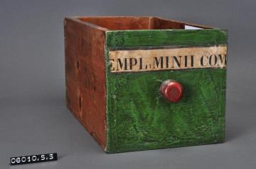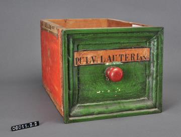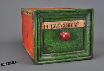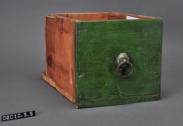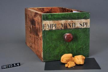 Schublade aus Nadelholz mit rotem Knauf. Vorderfront grün maserierend angemalen. Gezinkte Verbindungen (Schwalbenschwanzverbindung). Durchgehender Boden angeleimt und mit Holznägeln gesichert. Aufgeklebte, mit Signierapparat bedruckte, seitlich zugeschnittene Papiersignatur. Enthält Einfaches Bleipflaster in Brocken.