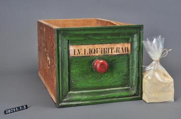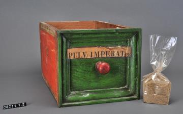 Schublade aus Nadelholz mit rotem Knauf. Profilierte Vorderfront, grün maserierend angemalen. Gezinkte Verbindungen (Schwalbenschwanzverbindung). Innen mit Abteiler aus Holz. Seitenteil aus älterer, rot angemalener, Schubladenvorderfront. Boden angeleimt und mit Holznägeln gesichert. Aufgeklebte, mit Signierapparat bedruckte Papiersignatur. Enthält Süßholzwurzel-Pulver.