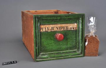 Schublade aus Nadelholz mit rotem Knauf. Profilierte Vorderfront, grün maserierend angemalen. Gezinkte Verbindungen (Schwalbenschwanzverbindung). Innen mit Abteiler aus Holz. Seitenteil aus älterer, rot angemalener, Schubladenvorderfront. Boden angeleimt und mit Holznägeln gesichert. Aufgeklebte, mit Signierapparat bedruckte Papiersignatur. Enthält Wacholderbeeren-Pulver.