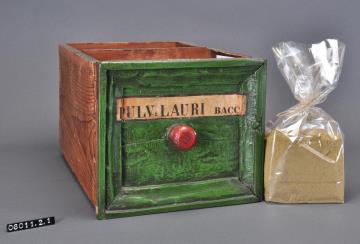 Schublade aus Nadelholz mit rotem Knauf. Profilierte Vorderfront, grün maserierend angemalen. Gezinkte Verbindungen (Schwalbenschwanzverbindung). Innen Abteiler aus Holz. Seitenteil aus älterer, rot angemalener, Schubladenvorderfront. Boden angeleimt und mit Holznägeln gesichert. Aufgeklebte, mit Signierapparat bedruckte Papiersignatur. Enthält Lorbeer-Pulver.