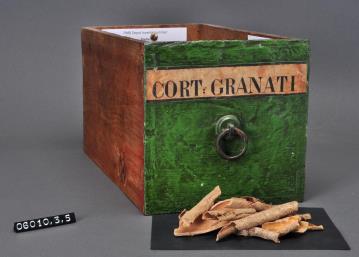 Schublade aus Nadelholz mit handgeschmiedetem Eisenring an einer Öse als Knauf. Vorderfront grün maserierend angemalen. Gezinkte Verbindungen (Schwalbenschwanzverbindung). Durchgehender Boden angeleimt und mit Holznägeln gesichert. Aufgeklebte, mit Signierapparat bedruckte, seitlich zugeschnittene Papiersignatur. Enthält Granatbaumrinde als Ganzdroge.