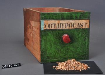 Schublade aus Nadelholz mit rotem Knauf. Vorderfront grün maserierend angemalen. Gezinkte Verbindungen (Schwalbenschwanzverbindung). Durchgehender Boden angeleimt und mit Holznägeln gesichert. Aufgeklebte, mit Signierapparat bedruckte, seitlich zugeschnittene Papiersignatur. Enthält Weiße Kreide = Calcium carbonicum in Stücken und gepulvert.