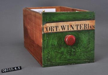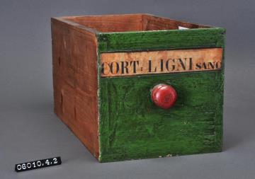 Schublade aus Nadelholz mit rotem Knauf. Vorderfront grün maserierend angemalen. Gezinkte Verbindungen (Schwalbenschwanzverbindung). Durchgehender Boden angeleimt und mit Holznägeln gesichert. Aufgeklebte, mit Signierapparat bedruckte, seitlich zugeschnittene Papiersignatur. Enthielt Zitronenbaum-Rinde.