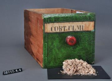 Schublade aus Nadelholz mit rotem Knauf. Vorderfront grün maserierend angemalen. Gezinkte Verbindungen (Schwalbenschwanzverbindung). Durchgehender Boden angeleimt und mit Holznägeln gesichert. Aufgeklebte, mit Signierapparat bedruckte, seitlich zugeschnittene Papiersignatur. Enthält Ulmenrinde, geschnitten.