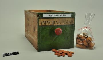 Schublade aus Nadelholz mit rotem Knauf. Vorderfront grün maserierend angemalen. Gezinkte Verbindungen (Schwalbenschwanzverbindung). Durchgehender Boden angeleimt und mit Holznägeln gesichert. Aufgeklebte, mit Signierapparat bedruckte, seitlich zugeschnittene Papiersignatur. Enthält Mandeln und Steinkerne des Mandelbaumes. Zusätzliche Beschriftung mit AMYGDAL: DULC: