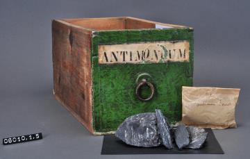 Schublade aus Nadelholz mit handgeschmiedetem Ring als Knauf. Vorderfront grün maserierend angemalen. Gezinkte Verbindungen (Schwalbenschwanzverbindung). Durchgehender Boden angeleimt und mit Holznägeln gesichert. Aufgeklebte, mit Signierapparat bedruckte, seitlich zugeschnittene Papiersignatur. Enthält Antimon in Stücken und Antimonii Pulvis Jenner, Antimon Pulver nach Dr. Jenner.