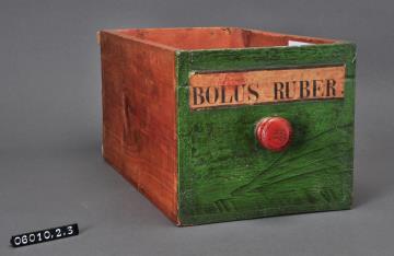 Schublade aus Nadelholz mit rotem Knauf. Vorderfront grün maserierend angemalen. Gezinkte Verbindungen (Schwalbenschwanzverbindung). Durchgehender Boden angeleimt und mit Holznägeln gesichert. Aufgeklebte, mit Signierapparat bedruckte, seitlich zugeschnittene Papiersignatur. Enthielt Roter Bolus, rotes Eisenoxid.