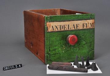 Schublade aus Nadelholz mit rotem Knauf. Vorderfront grün maserierend angemalen. Gezinkte Verbindungen (Schwalbenschwanzverbindung). Durchgehender Boden angeleimt und mit Holznägeln gesichert. Aufgeklebte, mit Signierapparat bedruckte, seitlich zugeschnittene Papiersignatur. Enthält Räucherkerzen in Stangen und pyramidenförmig.