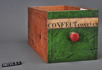Schublade aus Nadelholz mit rotem Knauf. Vorderfront grün maserierend angemalen. Gezinkte Verbindungen (Schwalbenschwanzverbindung). Durchgehender Boden angeleimt und mit Holznägeln gesichert. Aufgeklebte, mit Signierapparat bedruckte, seitlich zugeschnittene Papiersignatur. Enthielt ein Wurmmittel.