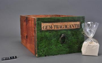Schublade aus Nadelholz mit handgeschmiedetem Ring als Knauf. Ring ist an einer Öse befestigt, welche an der Schubladeninnenseite umgeschlagen wurde. Gezinkte Verbindungen (Schwalbenschwanzverbindung). Durchgehender Boden angeleimt, und mit Holznägeln gesichert. Vorderfront grün maserierend angemalen. Aufgeklebte, mit Signierapparat bedruckte, Papiersignatur. Enthält Traganth, Pulver.