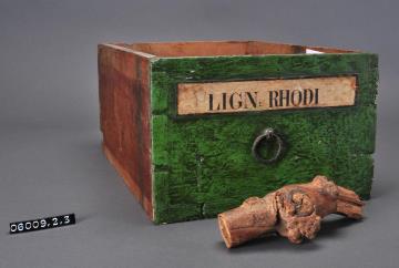 Schublade aus Nadelholz mit rotem Knauf; gezinkte Verbindungen (Schwalbenschwanzverbindung). Durchgehender Boden angeleimt, und mit Holznägeln gesichert. Vorderfront grün mit aufgeklebter Papiersignatur. Enthält Myrrhe in Tropfen.