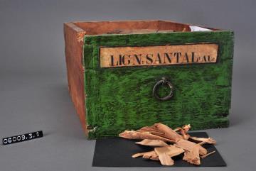 Schublade aus Nadelholz mit handgeschmiedetem Ring als Knauf. Ring ist an einer Öse befestigt, welche an der Schubladeninnenseite umgeschlagen wurde. Gezinkte Verbindungen (Schwalbenschwanzverbindung). Durchgehender Boden angeleimt, und mit Holznägeln gesichert. Vorderfront grün maserierend angemalen. Aufgeklebte, mit Signierapparat bedruckte, Papiersignatur. Enthält Rotes Sandelholz, geraspelt und eine Spanschachtel mit Pulver.