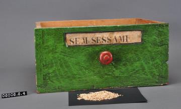 Schublade aus Nadelholz mit rotem Knauf und gezinkten Verbindungen (Schwalbenschwanzverbindung). Boden angeleimt und mit Holznägeln gesichert. Mittiger Abteiler. Vorderfront grün mit aufgeklebter Papiersignatur. Enthält Sesam, Ganzdroge.
