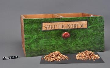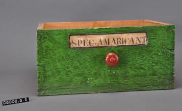 Schublade aus Nadelholz mit rotem, teilweise abgesprungenem, Knauf und gezinkten Verbindungen (Schwalbenschwanzverbindung). Boden angeleimt und mit Holznägeln gesichert. Innen mit weißem Papier ausgekleidet. Vorderfront grün mit aufgeklebter Papiersignatur. Enthielt Bärlappsamen.