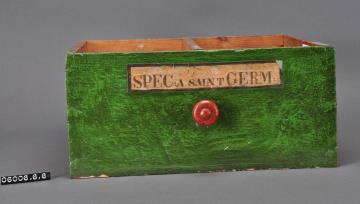 Schublade aus Nadelholz mit rotem Knauf und gezinkten Verbindungen (Schwalbenschwanzverbindung). Boden angeleimt und mit Holznägeln gesichert. Mittiger Abteiler. Vorderfront grün mit aufgeklebter Papiersignatur. Enthielt Abführtee St.Germain.