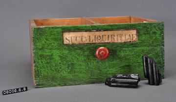 Schublade aus Nadelholz mit rotem Knauf und gezinkten Verbindungen (Schwalbenschwanzverbindung). Boden angeleimt und mit Holznägeln gesichert. Mittiger Abteiler. Vorderfront grün mit aufgeklebter Papiersignatur. Enthält Süßholzsaft, Lakritze.