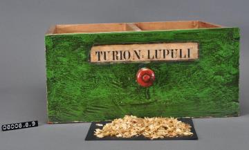 Schublade aus Nadelholz mit rotem Knauf und gezinkten Verbindungen (Schwalbenschwanzverbindung). Boden angeleimt und mit Holznägeln gesichert. Mittiger Abteiler. Vorderfront grün mit aufgeklebter Papiersignatur. Enthält Bierhopfen/ Hopfenzapfen geschnitten.