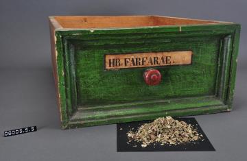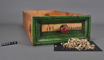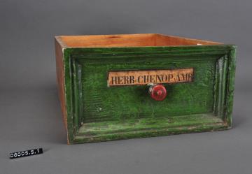 Schublade aus Nadelholz mit rotem Knauf und gezinkten Verbindungen (Schwalbenschwanzverbindung). Boden angeleimt und mit Holznägeln gesichert. Vorderfront grün mit aufgeklebter Papiersignatur. Enthielt Gänsefußkraut.