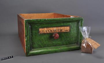 Schublade aus Nadelholz mit rotem Knauf und gezinkten Verbindungen (Schwalbenschwanzverbindung). Boden angeleimt und mit Holznägeln gesichert. Vorderfront grün mit aufgeklebter Papiersignatur. Enthält Pulver von gerösteten Eicheln.