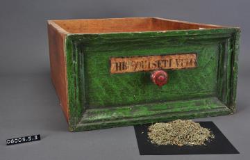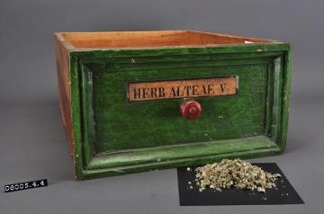 Schublade aus Nadelholz mit rotem Knauf und gezinkten Verbindungen (Schwalbenschwanzverbindung). Boden angeleimt und mit Holznägeln gesichert. Vorderfront grün mit aufgeklebter Papiersignatur. Am Seitenteil gezahntes Schild mit Preisangaben sowie handschriftlich mit Bleistift "Aibischkraut". Enthält Eibischkraut.