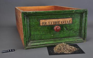 Schublade aus Nadelholz mit rotem Knauf und gezinkten Verbindungen (Schwalbenschwanzverbindung). Boden angeleimt und mit Holznägeln gesichert. Vorderfront grün mit aufgeklebter Papiersignatur. Enthält Augentrost-Kraut geschnitten.