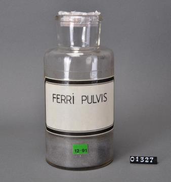 Rundes Pulverglas mit Stopfen aus farblosem Glas. Verdickter, gerundeter Mündungsrand. Flache Schulter. Mit Schablone beschriftetes und mit Klarsichtfolie überzogenes Papierschild, achteckig, mit schwarzem Doppelrand und schwarzer Schrift auf ehemals weißem Grund. Im Dezember 1991 aus dem Sortiment genommen (grünes Schild). Enthält Eisenpulver.