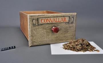 Schublade aus Nadelholz mit rotem Knauf und gezinkten Verbindungen (Schwalbenschwanzverbindung). Boden angeleimt und mit Holznägeln gesichert. Vorderfront maserierend grau-braun mit roter Signatur in aufgemalener Banderole. Enhält Maiglöckchenkraut, -blätter und -pulver.