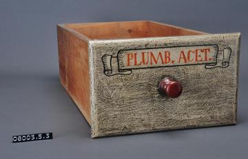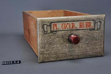 Schublade aus Nadelholz mit rotem Knauf und gezinkten Verbindungen (Schwalbenschwanzverbindung). Boden angeleimt und mit Holznägeln gesichert. Seitliche Schubladenwand rechteckiges, gezähntes, weißes Etikett mit doppeltem schwarzem Rand mit Preisangabe für Secale cornutum. Vorderfront maserierend grau-braun mit roter Signatur in aufgemalener Banderole. Enhielt Bleiweiß