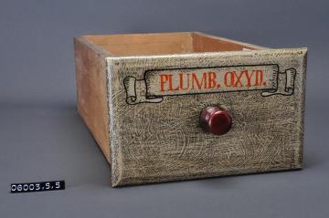 Schublade aus Nadelholz mit rotem Knauf und gezinkten Verbindungen (Schwalbenschwanzverbindung). Boden angeleimt und mit Holznägeln gesichert. Vorderfront maserierend grau-braun mit roter Signatur in aufgemalener Banderole. Enhielt Bleiglätte.