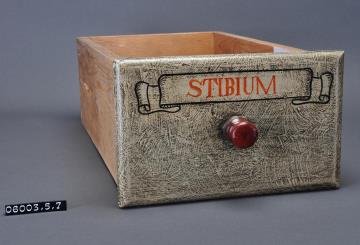 Schublade aus Nadelholz mit rotem Knauf und gezinkten Verbindungen (Schwalbenschwanzverbindung). Boden angeleimt und mit Holznägeln gesichert. Vorderfront maserierend grau-braun mit roter Signatur in aufgemalener Banderole. Enhielt Antimon