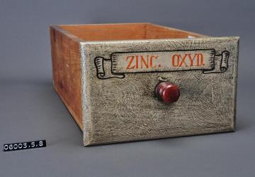 Schublade aus Nadelholz mit rotem Knauf und gezinkten Verbindungen (Schwalbenschwanzverbindung). Boden angeleimt und mit Holznägeln gesichert. Vorderfront maserierend grau-braun mit roter Signatur in aufgemalener Banderole. Enhielt Zinkoxid.
