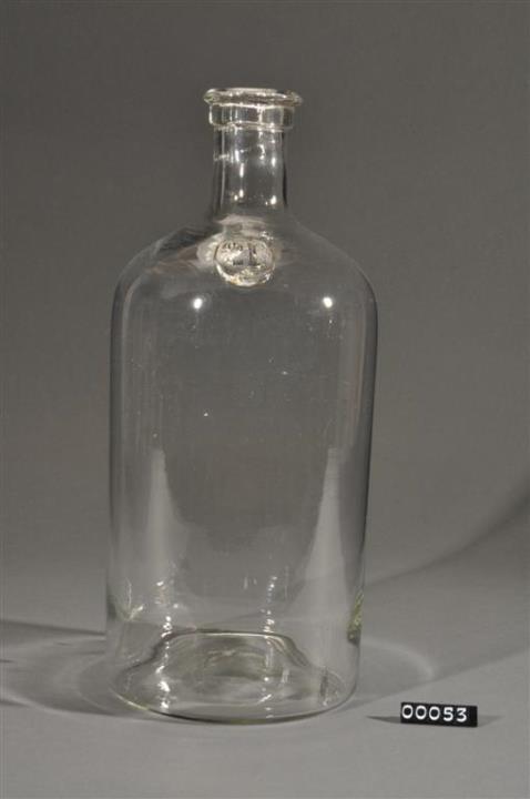 Zylindrischer, farbloser Flaschenkörper. Auf der Schulter aufgeschmolzenes Glassiegel, gestempelt mit 2 L. (Durchmesser ca. 27mm). Unregelmäßig ausgebogener, leicht verdickter Mündungsrand mit umgelegtem Faden. Boden leicht hochgestochen.