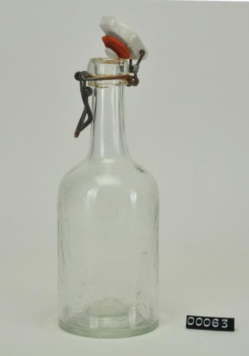 Farblose Enghalsflasche aus Glas, langer Hals mit Klappverschluss. Klappverschluss (Bügelverschluss) aus Porzellan mit Gummidichtung. 1877 ließ sich der aus Magdeburg stammende Hermann Grauel den Klappdeckelverschluss patentieren. Unter der Bezeichnung Seltersverschluss blieb er bis 1969 der vorherrschende Verschluss für Mineralwasser.