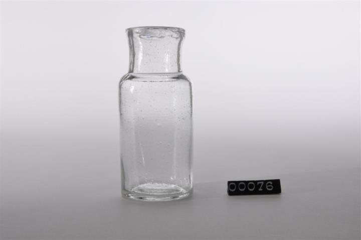 Farbloser, zylindrischer Flaschenkörper mit kleiner Schulter und vielen kleinen Lufteinschlüssen. Mündungsrand verdickt und ausgebogen. Mit Bodenprägung. Leicht hochgestochener Boden.