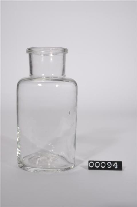 Farbloser, hoher, zylindrischer Flaschenkörper mit flacher, abgerundeter Schulter; kurzer Hals mit verdicktem Mündungsrand. Leicht hochgestochener Boden ohne Bodenprägung.