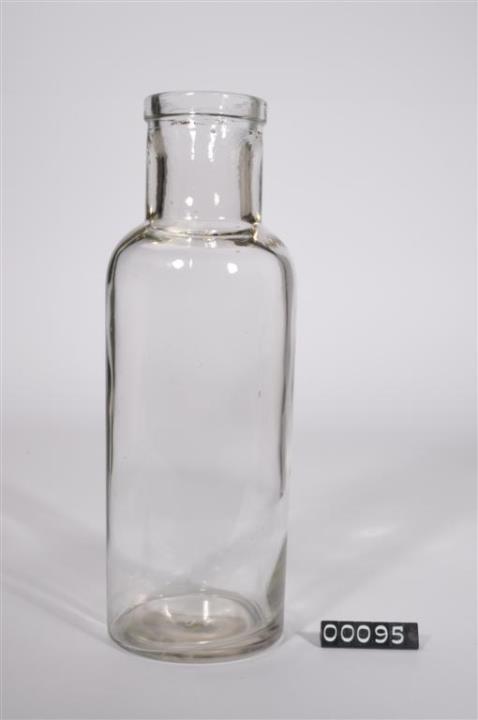 Farbloser, hoher, zylindrischer Flaschenkörper mit abgeflacher Schulter, seitlicher Naht und vielen Lufteinschlüssen; Hals mit verdicktem Mündungsrand. Leicht hochgestochener Boden ohne Bodenprägung.