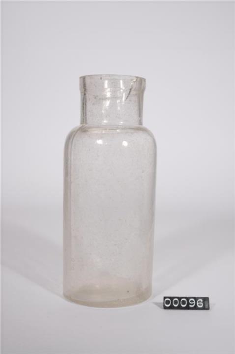 Farbloser, zylindrischer Flaschenkörper mit abgeflacher Schulter, seitlicher Naht und vielen Lufteinschlüssen; Hals mit leicht verdicktem Mündungsrand. Etwas hochgestochener Boden ohne Bodenprägung.