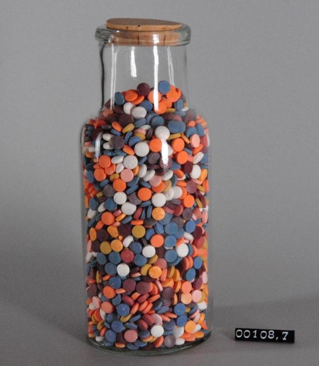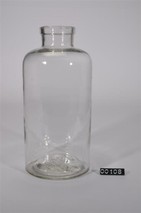 Farbloser, zylindrischer Flaschenkörper mit runder Schulter; Mündungsrand mit angeschmolzenem dicken Glasfaden. Seitliche Naht. Etwas hochgestochener Boden mit Bodenprägung.