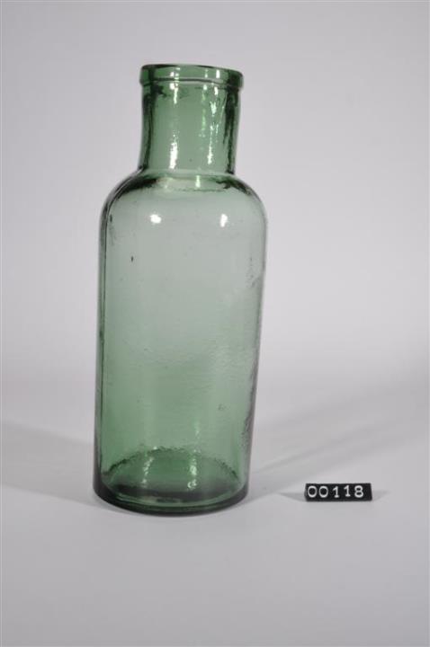 Grüner, zylindrischer Flaschenkörper mit runder Schulter; Mündungsrand mit angeschmolzenem Glasfaden. Seitliche Naht. Nach aussen gewölbter Boden, steht deshalb schief. Mit Bodenprägung.