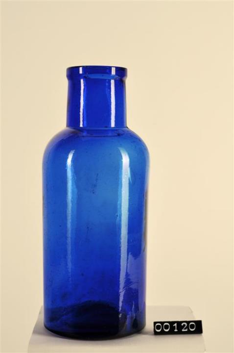 Blauer, zylindrischer Flaschenkörper mit abgeflachter Schulter; Mündungsrand verdickt. Viele Lufteinschlüsse. Seitliche Naht. Nach oben gewölbter Boden mit Bodenprägung.