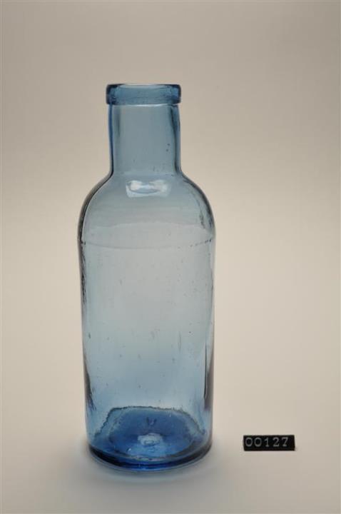 Hellblauer, zylindrischer Flaschenkörper mit hochgezogener Schulter; Mündungsrand mit aufgelegtem Faden. Schulter und Schulterrand mit Seitennaht. Viele Lufteinschlüsse. Nach oben gewölbter Boden, großer Standring. Ohne Bodenprägung.