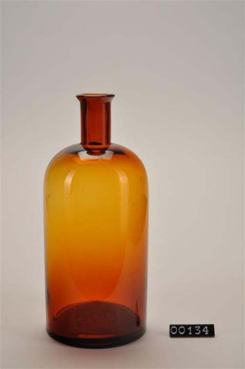 Brauner, zylindrischer Flaschenkörper mit abfallender Schulter; Mündungsrand nach außen gebogen. Leicht hochgestochener Boden mit Bodenprägung.