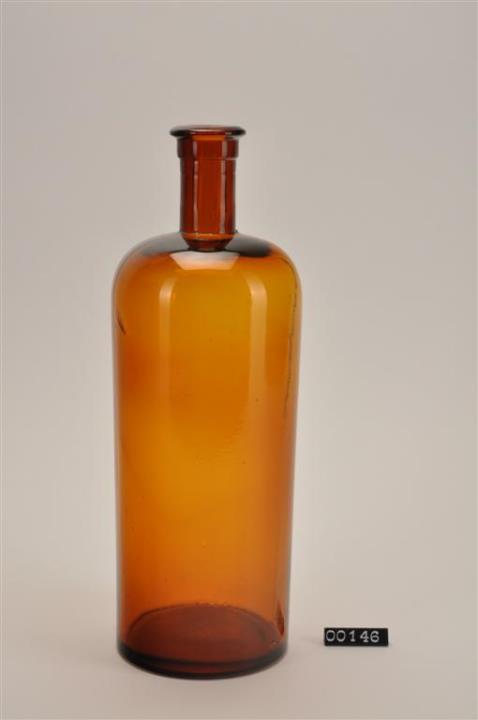 Brauner, zylindrischer Flaschenkörper mit flacher Schulter und langem Hals; Mündungsrand nach außen gebogen, verdickt. Mit seitlicher Naht. Leicht nach oben gewölbter Boden ohne Bodenprägung.