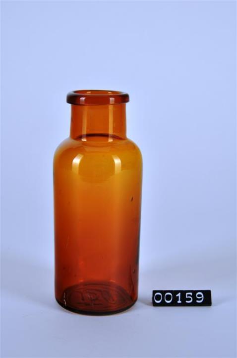 Brauner, zylindrischer Flaschenkörper mit abfallender Schulter; Mündungsrand unregelmäßig verdickt. Konischer, nach oben sich verjüngender Hals. Nach oben gewölbter Boden mit Bodenprägung.