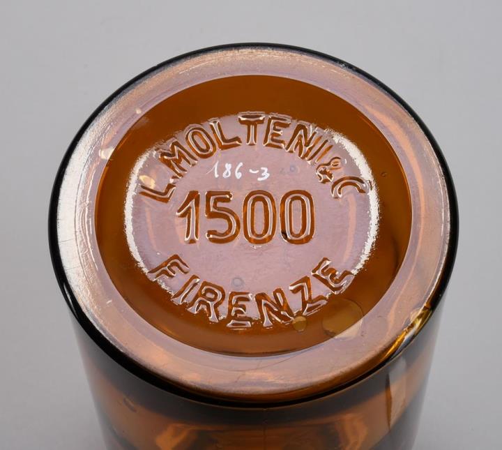 Rotbrauner, zylindrischer Flaschenkörper, maschinell hergestellt, mit abfallender Schulter und Seitennaht; mit Lufteinschlüssen. Mündungsrand manuell aufgesetzt. Nach oben gewölbter Boden mit Bodenprägung. 186-3 mit Bodenprägung der Firma Molteni, Firenze.