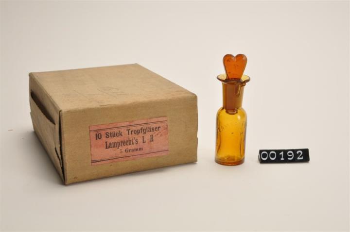 Orig.Lamprechts-Patent-Tropfglas, L.H. (vitra patentata) runde Form, mit Gießlippe und herzförmigem Schliffstopfen zur sicheren Anbringung des Rezepturfadens. Braunes Glas.